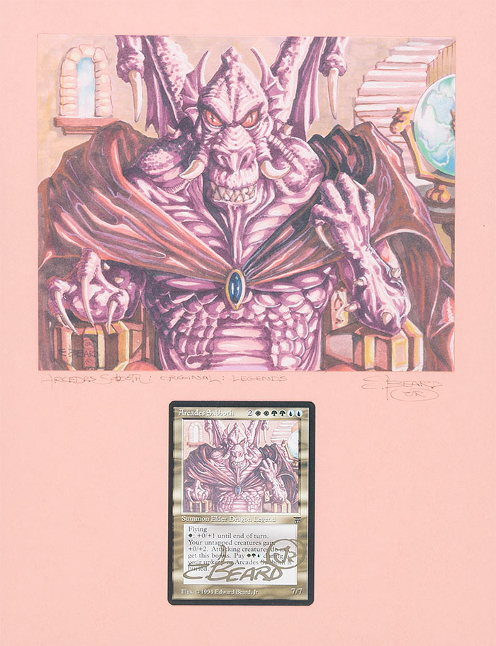 Ed Beard Jr. Magic: The Gathering - Legends Card #142 "Arcades Sabboth" Painting Original Art and Signed Card (Wizards of the Coast, 1994). The elder dragon has been summoned... and he must be fed every turn to keep him. A powerful image for a powerful card, painted by master painter Ed Beard Jr. The original art was created in ink, color marker, and color pencil